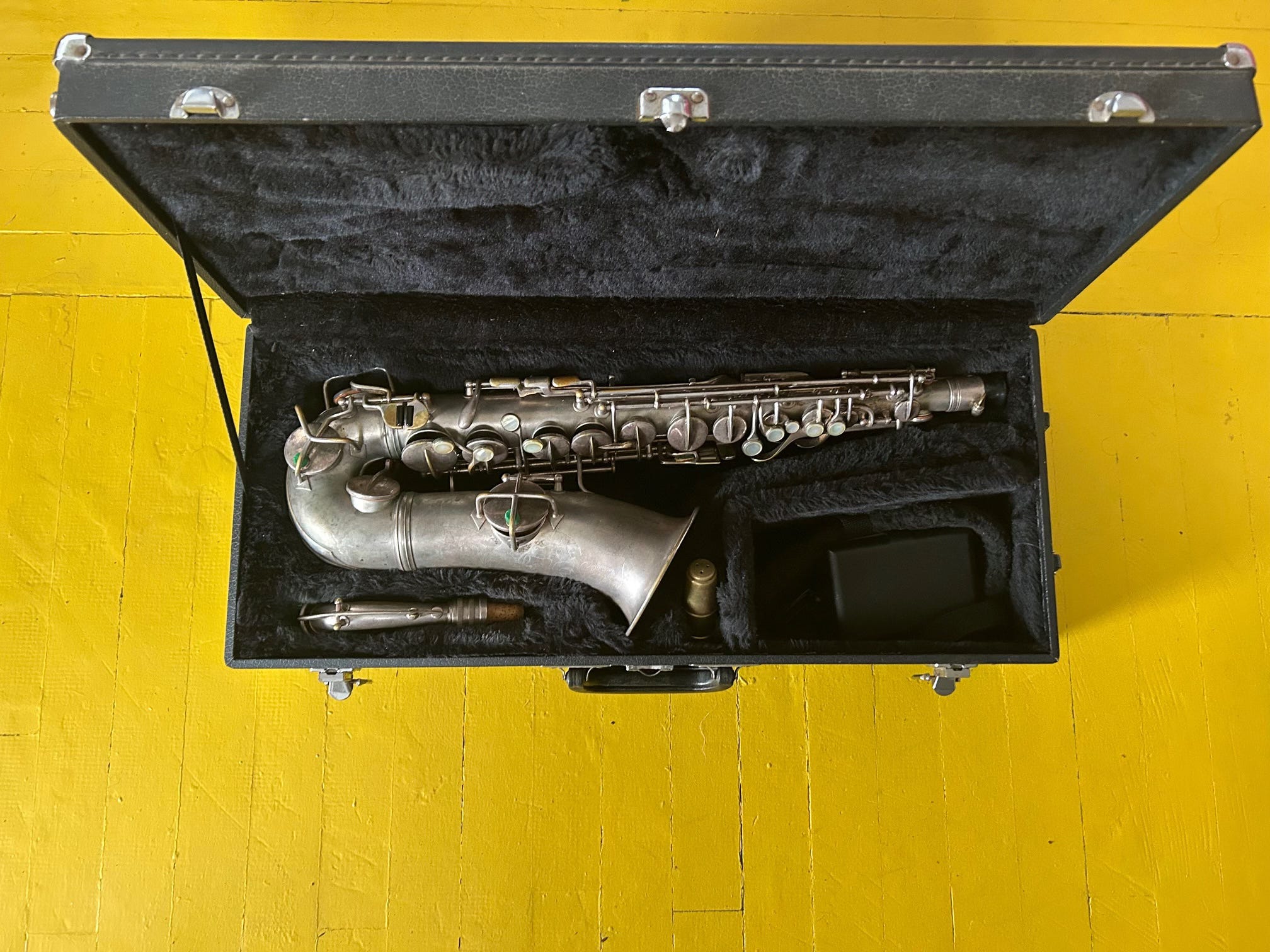 The instrument inside is old, made in 1927 by the legendary G. G. Conn Ltd. of Elkhart, Indiana, in its Wonder Series 11 Alto Saxophone line. And it is beautiful, with its silver-plated body engraved with floral scrollwork, its mother-of-pearl key touch pieces.